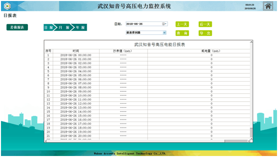 日报表,可以通过设定日期,以及楼层回路来查询当天内各个时段的抄表值和耗电量。