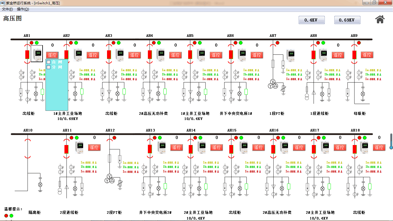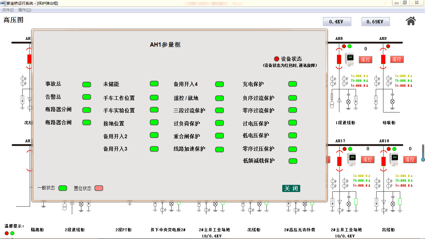 界面显示项目主接线图状态,页眉为项目名称信息。当有系统通信故障时,通信指示灯爆红,提示通讯故障。正常情况下,通讯指示灯常绿。