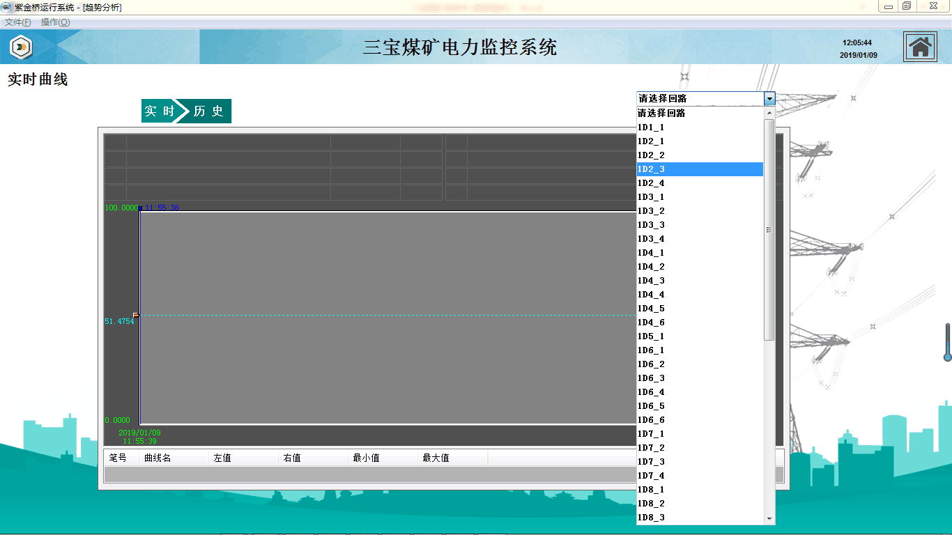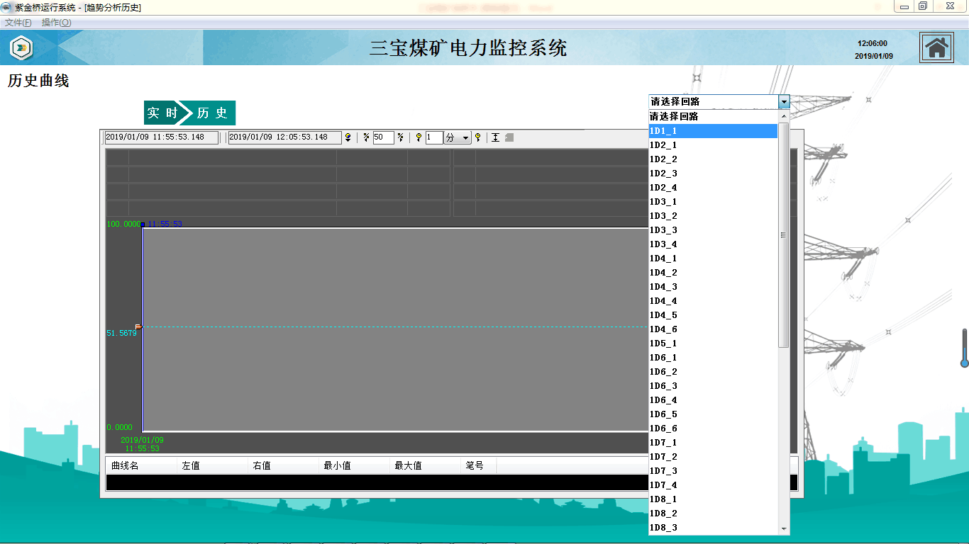 历史曲线按区域划分子项,点击进入之后,勾选需要显示的对象,一般为电流、电压、功率、温度等,通过设置查询时间,可以将时间段内的数据查询出来以曲线的形式进行显示,并可以对X轴、Y轴进行缩放功能,便于对曲线数据进行分析。