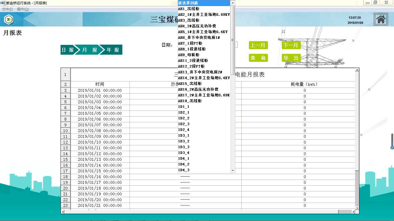 月报表,可以通过设定日期,以及楼层回路来查询当月每天的抄表值和耗电量。以月为周期,查询日期设定起始时间为每个月的1号。(截止时间为30/31)