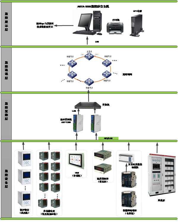 上图即为一个典型的系统物理结构,变电所内部设备通过RS485网络到通信箱,通信箱内置通信管理机和UPS电源等,将本地数据进行采集,通过通信箱的交换机与各个区域组成光纤环网,中控室则安装监控软件系统。