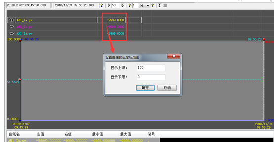 历史曲线基本操作与实时操作相同。有区别的是可以在如图标记的查询条件设置栏内选择查询条件,设置起始时间,曲线按百分比左右移动,以及设定曲线的上限值。