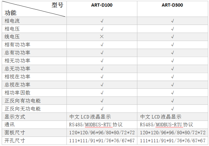 ART-D系列网络电力仪表按IEC标准设计,具有全电量测量,电能统计,电能质量分析及网络通讯等功能,主要用于对电网供电质量的综合监控诊断及电能管理。 产品概述 ● 采用高性能32位处理芯片,搭配独立计量芯片,测量精度高,运行速度快。 ● 中文LCD液晶屏,彰显高端。 ● 可选择多种选配功能,满足不同场合使用。 ● 额定电流:AC5A/AC1A。 ● 额定电压:AC380/220V,AC100/57.7V。