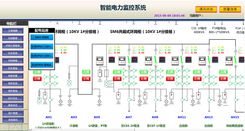主接线图二级菜单,按区域划分为多个子项,单击任一子项,进入子项的系统主接线图。系统主接线根据系统设计图纸,还原系统结构,并将实时信息进行显示,点击任一显示项,可以进入仪器仪表的详细实时信息。