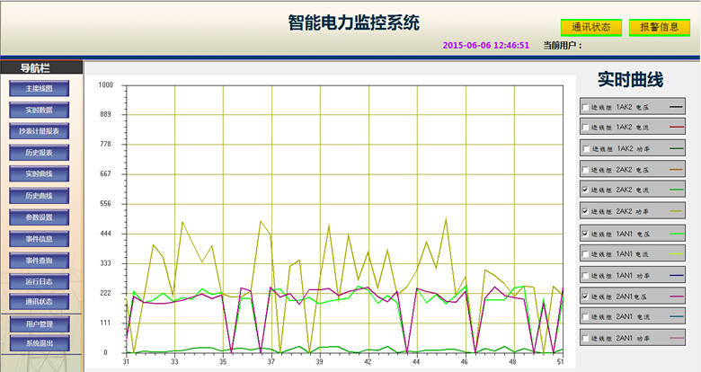 实时曲线按区域划分子项,点击进入之后,勾选需要显示的对象,一般为电流、电压、功率、温度等,即可显示所选对象的实时曲线。