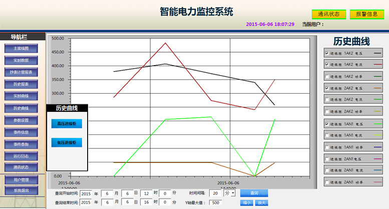 历史曲线按区域划分子项,点击进入之后,勾选需要显示的对象,一般为电流、电压、功率、温度等,通过设置查询时间,可以将时间段内的数据查询出来以曲线的形式进行显示,并可以对X轴、Y轴进行缩放功能,便于对曲线数据进行分析。