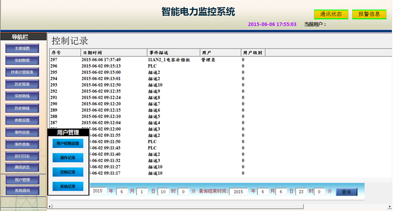用户管理分为:用户权限设置、操作记录、控制记录、系统记录等4个子项,用户权限可以在高等级的用户授权下,进行用户权限设置和更改,操作记录为系统操作的记录情况,如:页面切换,系统数据查询,设备操作等都有详细的记录;控制记录为记录系统下发控制的信息,包括,时间、用户、操作了哪些控制等,作为后续控制系统分析的重要依据;系统记录为记录系统运行的相关状态,如:系统重新启动,系统加载失败等信息。
